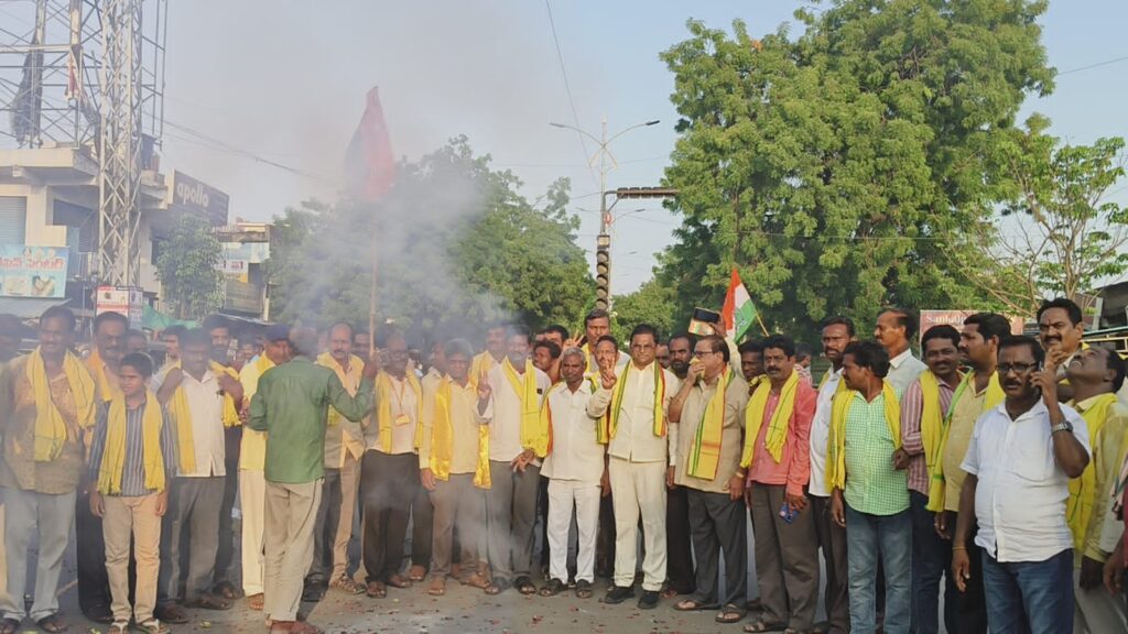 కోదాడ జూన్ 04(mbmtelugunews)ప్రతినిధి మాతంగి సురేష్:ఆంధ్రప్రదేశ్లో సైకో పాలనకు చరమగీతం పాడి తెలుగుదేశం కూటమిని అధికారంలోకి తీసుకువచ్చిన ఆంధ్ర ప్రజలందరికీ వందనాలు తెలియజేస్తూ కోదాడ నియోజకవర్గ తెలుగుదేశం పార్టీ ఆధ్వర్యంలో గెలుపు సంబరాలను కోదాడ క్రాస్ రోడ్ ఎన్టీఆర్ విగ్రహం పూలమాలలు వేసి పెద్ద ఎత్తున జరుపుకున్నారు.తెలుగుదేశం కార్యకర్తలు,శ్రేయోభిలాషులు, అభిమానులు పెద్ద ఎత్తున పాల్గొని బాంబులు కాలుస్తూ సంబరాలు జరుపుకున్నారు.