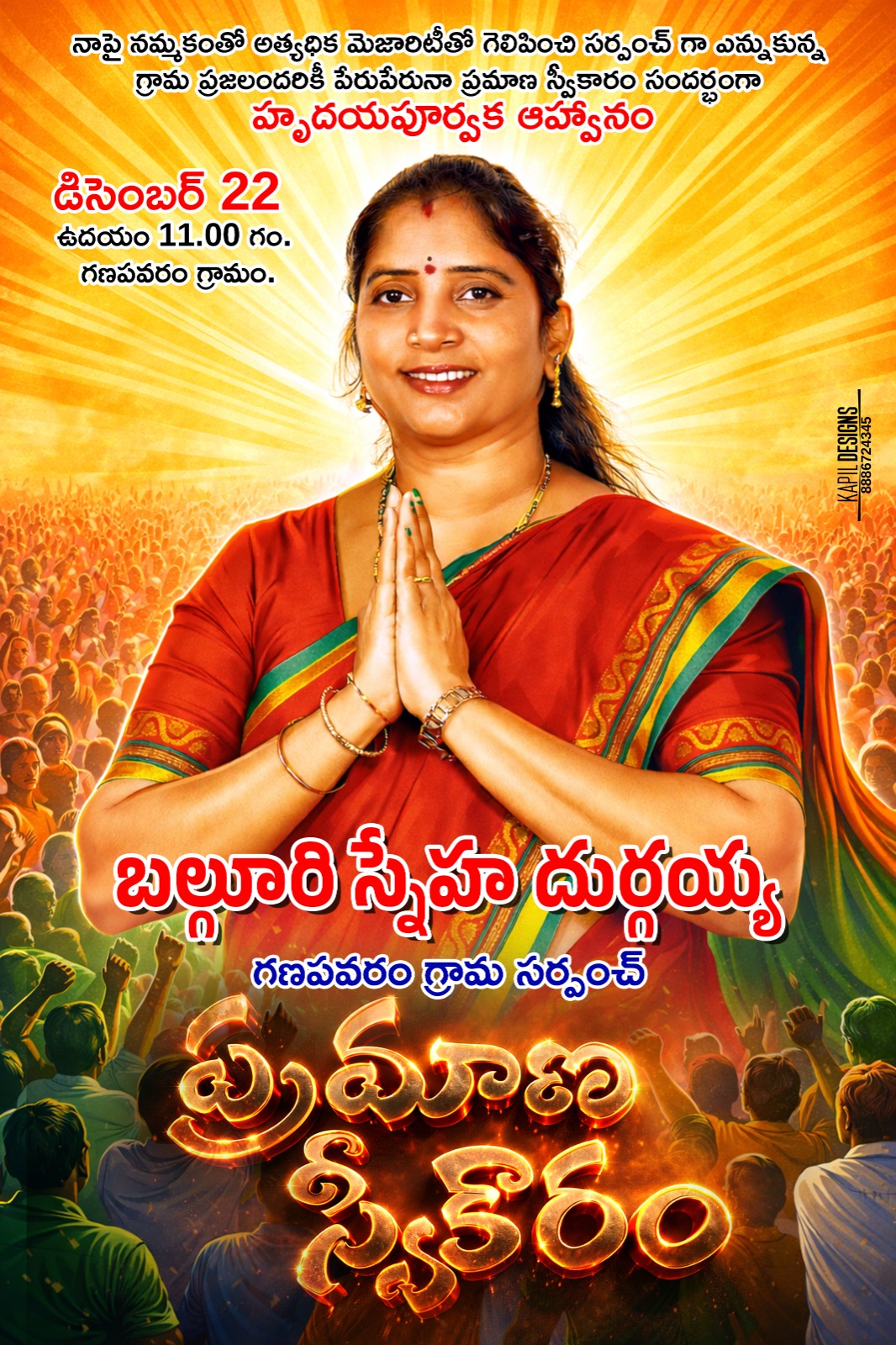 Mbmtelugunews//కోదాడ, డిసెంబర్ 21(ప్రతినిధి మాతంగి సురేష్): తేది;14.12.2025 నాడు జరిగిన గణపవరం గ్రామపంచాయతీ ఎన్నికలలో గ్రామ సర్పంచిగా నన్ను గెలిపించినందుకు మీకు పాదాభివందనాలు తెలియజేస్తున్నాను.. అలాగే నాతోపాటుగా సహచర వార్డు సభ్యులను గెలిపించినందుకు కృతజ్ఞతలు.. మీ యొక్క ప్రేమ ఆదరాభిమానాలతో తేదీ:22.12.2025, నాడు ఉదయం గం.9-00 గంటలకు మన ఊరు గ్రామపంచాయతీ కార్యాలయం నందు ప్రమాణ స్వీకార కార్యక్రమం నిర్వహిస్తున్నందున పార్టీలకు కులమతాలకు అతీతంగా మీరందరూ తప్పకుండా హాజరై, మీ యొక్క ఆశీర్వాదాలు అందించగలరని బలుగూరి స్నేహ దుర్గయ్య, పాలకవర్గం కోరుకొనుచున్నారు.