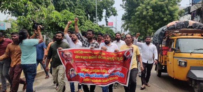 ఆతరువాత ఖమ్మం క్రాస్ రోడ్డు వరకు ర్యాలీ కొనసాగింది ర్యాలీ ముగింపు కు ముందు తెలంగాణ తల్లికి పూల మాల వేసి నివాళి ఘటించడం జరిగింది అమరుల స్ఫూర్తి తో గద్దరన్న యాదిలో జరుగు సభను విజయవంతం చేయాలని పిలుపునివ్వడం జరిగింది.ఇట్టి ర్యాలీ లో 6 మండలాల కో-ఆర్డినేటర్లు పోలంపల్లి బాబు,రేపాకుల నరేష్,మోసిన్ బేగ్,అనిల్ తదితరులు పాల్గొన్నారు.