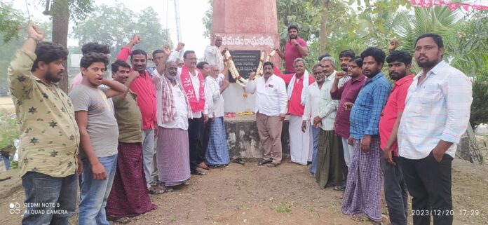 కోదాడ,డిసెంబర్ 20(mbmtelugunews)ప్రతినిధి మాతంగి సురేష్:మండల పరిధిలోని తమ్మర గ్రామానికి చెందిన సీనియర్ సిపిఐ నాయకులు కామ్రేడ్ కమతం రాఘవయ్య వర్ధంతి వేడుకలను తమ్మరలో రాఘవయ్య స్థూపం వద్ద ఘనంగా నిర్వహించారు.ఈ సందర్భంగా సిపిఐ మండల కార్యదర్శి 17 వ వార్డ్ మున్సిపల్ కౌన్సిలర్ బత్తినేని హనుమంతరావు మాట్లాడుతూ కమతం రాఘవయ్య తెలంగాణ సాయుధ పోరాటంలో కీలక పాత్ర పోషించాడని అదేవిధంగా 30 సంవత్సరాలు తమ్మర సర్పంచ్ గా గ్రామంలో ఎన్నో సేవలు అందించారని కొనియాడారు.ఈ కార్యక్రమంలో సిపిఐ సీనియర్ నాయకులు పోతురాజు సత్యనారాయణ,గొట్టముక్కల కోటి నారాయణ,కమతం పుల్లయ్య,ఏఐటీయూసీ నాయకులు జీవి రాజు,కోటేశ్వరరావు,సుందరయ్య,రాంబాబు తదితరులు పాల్గొన్నారు