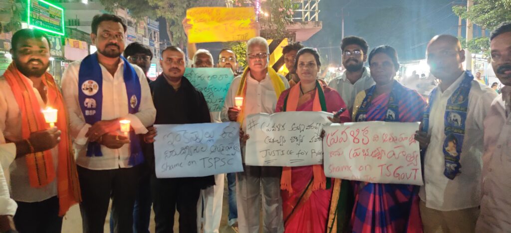 కోదాడ,అక్టోబర్ 25(mbmtelugunews)ప్రతినిధి మాతంగి సురేష్:నిరుద్యోగి ప్రవళిక ఆత్మహత్య ముమ్మాటికీ ప్రభుత్వ హత్య రాబోయే ఎన్నికలలో యువత నిరుద్యోగులు తెలంగాణ రాష్ట్ర ప్రభుత్వానికి బుద్ధి చెప్పాలని టీఎస్ యు ఓయు అధ్యక్షులు ఎన్ఎం శ్రీకాంత్ యాదవ్ అన్నారు.శనివారం రాత్రి కోదాడ పట్టణంలోని తెలంగాణ తల్లి విగ్రహం వద్ద పార్టీలకు అతీతంగా కొవ్వొత్తులతో నిరసన కార్యక్రమాన్ని ఏర్పాటు.ఈ కార్యక్రమానికి ముఖ్య అతిథులుగా బిజెపి నాయకులు ఎన్ఎం శ్రీకాంత్ యాదవ్,నూకల పద్మా రెడ్డి,బిఎస్పి నాయకులు పిల్లుట్ల శ్రీనివాస్,సామాజిక కార్యకర్త కొల్లు వెంకటేశ్వరరావు,పోడుగు హుస్సేన్,ఐ టిడిపి కార్యదర్శి వివేకానందులు పాల్గొని ప్రవళికకు సంఘీభావం తెలిపారు.అనంతరం వారు మాట్లాడుతూ ఆశల చితికి లీకుల నిప్పంటించి నిరుద్యోగులను పాడెలెక్కిస్తున్న రాష్ట్ర ప్రభుత్వ మూర్ఖపు విధానం, టీఎస్పీఎస్సీ నిర్లక్ష్యం వల్లనే నిరుద్యోగులకు ఉద్యోగాలు రాక మనస్తాపానికి గురై ఆత్మహత్యలకు పాల్పడుతున్నారని అన్నారు.