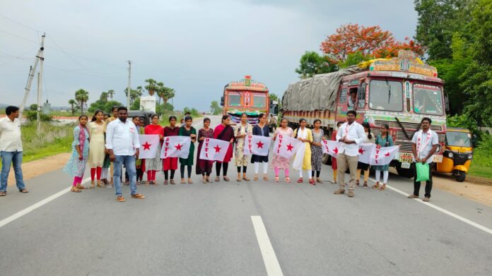 చిలుకూరు,జూన్ 22(mbmtelugunews)ప్రతినిధి మాతంగి సురేష్:నీట్ పరీక్షను రద్దుచేసి తిరిగి పరీక్ష నిర్వహించాలని కోరుతూ కోదాడ-జడ్చర్ల జాతీయ రహదారిపై డివైఎఫ్ఐ ఆధ్వర్యంలో ధర్నా శనివారం నిర్వహించారు.ఈ సందర్భంగా డివైఎఫ్ఐ సూర్యాపేట జిల్లా కార్యదర్శి బోయిళ్ల నవీన్ మాట్లాడుతూ ఈ దేశంలో ఎంతో ప్రతిష్టాత్మకంగా నిర్వహించే నీట్ పరీక్ష పత్రం లీకేజ్ జరిగిందని అన్నారు