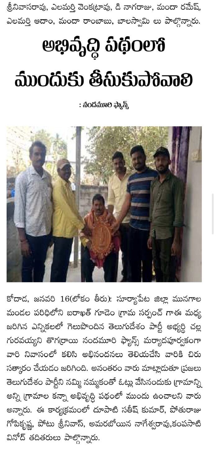 Mbmtelugunews//కోదాడ, జనవరి 16(ప్రతినిధి మాతంగి సురేష్): సూర్యాపేట జిల్లా మునగాల మండల పరిధిలోని బరాఖత్ గూడెం గ్రామ సర్పంచ్ గాఈ మధ్య జరిగిన ఎన్నికలలో గెలుపొందిన తెలుగుదేశం పార్టీ అభ్యర్థి చల్ల గురవయ్యని తొగర్రాయి నందమూరి ఫ్యాన్స్ మర్యాదపూర్వకంగా వారి నివాసంలో కలిసి అభినందనలు తెలియచేసి వారికి చిరు సత్కారం చేయడం జరిగింది. అనంతరం వారు మాట్లాడుతూ ప్రజలు తెలుగుదేశం పార్టీని నమ్మి నమ్మకంతో ఓట్లు వేసినందుకు గ్రామాన్ని అన్ని గ్రామాల కన్నా అభివృద్ధి పథంలో ముందు ఉంచాలని వారు అన్నారు. ఈ కార్యక్రమంలో దూపాటి సతీష్ కుమార్, పోతురాజు గోపికృష్ణ, పోటు శ్రీనివాస్, అమరబోయిన నాగేశ్వరావు,
