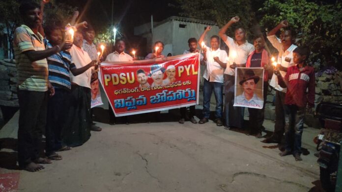 Mbmtelugunews//కోదాడ,మార్చి 23(ప్రతినిధి మాతంగి సురేష్):కొమరబండ గ్రామంలో ప్రగతిశీల యువజన సంఘం(పివైఎల్) ఆధ్వర్యంలో భగత్ సింగ్ రాజగురు సుఖదేవుల 94 వ వర్ధంతి సందర్భంగా కొవ్వొత్తులు వెలిగించి వారికి నివాళ్లు అర్పించడం జరిగింది.ఈ సందర్భంగా అరుణోదయ జిల్లా అధ్యక్షుడు ఉదయగిరి పాల్గొని మాట్లాడుతూ బ్రిటిష్ సామ్రాజ్యవాదానికి వ్యతిరేకంగా భారతదేశ దాస్య శృంఖలాలను తెంచడానికి చిరునవ్వుతో ఉరికంబాన్ని ముద్దాడిన విప్లవ యువ కిశోరాలు భగత్ సింగ్,రాజగురు,సుఖదేవ్ లని అన్నారు.వారి త్యాగం ఉన్నతమైనదని దేశ చరిత్రలో చెరిగిపోనిదని యువతకు ఆదర్శప్రాయమైనదని తెలియజేశారు.స్వౌతంత్ర్యం అంటే కేవలం అధికార మార్పిడి మాత్రమే కాదని,ఏ దోపిడీ లేని సమాజం రావాలని కోరుకున్న సమతా మూర్తి భగత్ సింగ్ అని అన్నారు.77 సంవత్సరాల స్వతంత్ర భారతావనిలో వారు కలలుగన్న రాజ్యం నేటికీ కలగానే మిగిలిందని అన్నారు.దేశంలో పరిపాలన కొనసాగిస్తున్న బూర్జువ పాలకవర్గాలు సామాన్యుల పొట్టకొడుతు సంపన్నులకు దోచిపెడుతు దేశాన్ని అప్పుల కుప్పగా మార్చి వేశారని ఆవేదన వ్యక్తం చేశారు.ఈ దోపిడీ పాలకవర్గ విధానాలపై నేటి యువత భగత్ సింగ్,రాజగురు సుఖదేవులు అందించిన స్ఫూర్తితో ఉద్యమించాలని అదే వారికి అర్పించే నిజమైన నివాళి అని అన్నారు.ఈ కార్యక్రమంలో ప్రగతిశీల యువజన సంఘం జిల్లా నాయకులు అనంతరామయ్య, పిడిఎస్ యు జిల్లా నాయకులు డి వేణు,మద్దెల ప్రతాప్,మద్దెల వెంకన్న,కామల్ల సైదులు,జానయ్య,సుగునమ్మ,రవి తదితరులు పాల్గొన్నారు.