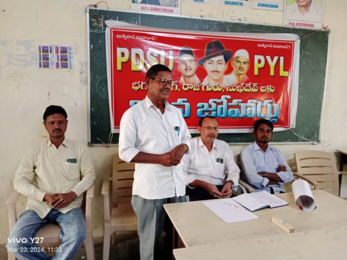 ఈ దేశంలో స్వేచ్ఛ, స్వాతంత్రం కోసం ప్రజలందరూ సమానత్వపు జీవితం జీవించాలని, బ్రిటీష్ వలస పాలనకు వ్యతిరేకంగా స్వాతంత్రోద్యమంలో తమ అమూల్యమైన ప్రాణాలను అర్పించిన విప్లవ వీరులు భగత్ సింగ్, రాజ్ గురు, సుఖదేవులు అన్నారు. వారి స్ఫూర్తి ఈ దేశానికి అవసరం అన్నారు. భగత్ సింగ్, రాజ్ గురు, సుఖదేవ్ పోరాట స్ఫూర్తితో యువతరం దేశంలో రోజురోజుకు పెరుగుతున్న మతోన్మాద ఫాసిస్ట్ విధానాలకు, కార్పోరేటీకరణకు వ్యతిరేకంగా పోరాడాలని పిలుపునిచ్చారు. ప్రధాని నరేంద్ర మోడీ ప్రభుత్వం అవలంబిస్తున్న రైతాంగ వ్యతిరేక విధానాలపై ప్రజలను చైతన్యం చేయాలని పిలుపునిచ్చారు. రాబోయే పార్లమెంటు ఎన్నికలలో మతోన్మాద బీజేపీ ఫాసిస్టు నరేంద్ర మోడీకి తగిన బుద్ధి చెప్పాలని అన్నారు. భగత్ సింగ్ అతి చిన్న వయసులోని పోరాటపటిమను అలవర్చుకొని స్వతంత్ర ఉద్యమంలో పోరాడి ఉరితాడు ముద్దాడి అమరుడయ్యాడు వారి స్ఫూర్తితో విద్యార్థులు యువకులు ఉద్యమించాలన్నారు విద్యారంగంలో ఉన్న అనేక రకాల సమస్యలపై ఉద్యమించి సాధించుకోవాలన్నారు నిరుద్యోగ సమస్య రోజురోజుకు పెరుగుతుందని తప్ప తగ్గే పరిస్థితి లేదు నిరుద్యోగులకు ఉద్యోగ అవకాశాలు కల్పించే విధంగా ఉద్యమాలను ఉదృతం చేయాలని పిలుపునిచ్చారు. *పివైఎల్ జిల్లా ప్రధాన కార్యదర్శి డి రవి, కే ఆర్ ఆర్ డిగ్రీ కళాశాల ప్రిన్సిపల్ నాగు* మాట్లాడుతూ విద్యార్థులు స్వతంత్ర ఉద్యమం కోసం తమ ప్రాణాలను తునప్రాయంగా అర్పించిన భగత్ సింగ్, రాజు గురు, సుఖదేవ్ ల చరిత్రను తెలుసుకొని వారి స్ఫూర్తితో సమాజంలో జరుగుతున్న అసమాన తలపై చైతన్యవంతులై ప్రశ్నించే తత్వాన్ని అలవర్చుకోవాలని పిలుపునిచ్చారు. ఈ కార్యక్రమంలో పిడిఎస్యు జిల్లా ప్రధాన కార్యదర్శి ఎం చందర్రావు, కే ఆర్ ఆర్ లెక్చరర్ సైదులు పాల్గొని మాట్లాడారు. కే ఆర్ ఆర్ కళాశాల ముఖద్వారంలోని భగత్ సింగ్ విగ్రహానికి పూలమాలవేసి నివాళులర్పించారు. ఈ కార్యక్రమంలో పిడిఎస్యు, పివైఎల్ నాయకులు వీరబాబు, మహేష్, నవీన్, రమ్య, రేణుక, జ్యోతి, సంధ్య, విద్యార్థిని విద్యార్థులు పాల్గొన్నారు.