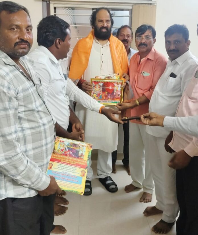 హైదరాబాద్,మే 18(mbmtelugunews)ప్రతినిధి మాతంగి సురేష్:కోదాడ మండల పరిధిలోని యర్రవరం గ్రామంలో ఎంతో ప్రసిద్ధి చెందిన శ్రీ బాల ఉగ్ర లక్ష్మి నరసింహ స్వామి కళ్యాణ జయంతోత్సవ కార్యక్రమాన్ని పురస్కరించుకొని కమిటీ సభ్యులు హైదరాబాదులోని మంత్రి ఉత్తమ్ కుమార్ రెడ్డి నివాసంలో కరపత్ర ఆవిష్కరణ కార్యక్రమాన్ని మంత్రి చేతుల మీదగా చేయించారు.ఈ సందర్భంగా మంత్రి మాట్లాడుతూ మా ప్రాంతంలో శ్రీ బాల ఉగ్ర లక్ష్మి నరసింహ స్వామి స్వయంబుగా వెలిసి ఎంతో మంది భక్తుల కోరికలు చేర్చడం మా ప్రాంతానికి గర్వకారణం అని అన్నారు.దేశంలోనే కోదాడ ప్రాంతానికి ఈ టెంపుల్ ద్వారా మంచి పేరు వచ్చిందని ఈ సందర్భంగా వారు గుర్తు చేశారు.అనంతరం ఆలయ కమిటీ గౌరవ అధ్యక్షులు భాషబోయిన భాస్కర్ మాట్లాడుతూ ఈనెల 21,22,23 తేదీలలో శ్రీ ధూళ్ళగుట్ట మహాక్షేత్ర వాల్మీకోద్భవ స్వయంయుక్త శ్రీ బాల ఉగ్ర లక్మి నరసింహ స్వామి వార్ల దివ్య కళ్యాణ మహోత్సవము నృసింహ ఉత్సవములు జరుగుతాయని కావున ఈ ఉత్సవాలకు దేశవ్యాప్తంగా భక్తులు అధిక సంఖ్యలో పాల్గొంటున్నారని అన్నారు.ఈ ఉత్సవాలకు ముఖ్య అతిథులుగా నీటిపారుదల@పౌరసరఫరాల శాఖ మంత్రి ఉత్తమ్ కుమార్ రెడ్డి,స్థానిక శాసన సభ్యురాలు నలమాద పద్మావతి రెడ్డిలు పాల్గొంటారని తెలిపారు.ఈ కార్యక్రమంలో ఆలయ కో కమిటీ,ఆలయ కమిటీ సభ్యులు గ్రామ పెద్దలు తదితరులు పాల్గొన్నారు.