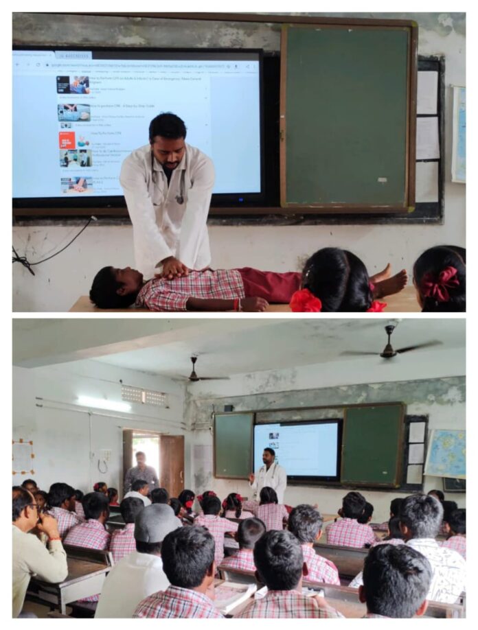 Mbmtelugunews//సూర్యాపేట, అక్టోబర్ 17(ప్రతినిధి మాతంగి సురేష్) :సిపిఆర్ పై ప్రతి ఒక్కరు అవగాహన కలిగి ఉండాలని డాక్టర్ వీరేంద్రనాథ్ తెలిపారు ప్రభుత్వ ఆదేశాల మేరకు ప్రభుత్వ విద్యాసంస్థల్లో టీఎస్ఆర్టీసీ బస్టాండ్లలో రైల్వేస్టేషన్లలో సిపిఆర్ అవగాహన కార్యక్రమంలో భాగంగా శుక్రవారం సూర్యాపేట జిల్లా ఆత్మకూరు(యస్) మండల పరిధిలోని కందగట్ల ప్రభుత్వ పల్లె దావఖనలో సి పి ఆర్ పై అవగాహన కార్యక్రమం నిర్వహించారు. ఈ సందర్భంగా డాక్టర్ మాట్లాడుతూ ప్రతి వంద మరణాల్లో పది మరణాలు ఆకస్మికంగా గుండె పోటుతో మరణిస్తున్నారని ఎవరైనా గుండె సమస్య తో మరణించినట్లయితే గుండె ఊపిరితిత్తుల పునర్జీవనం (సీపీఆర్) ద్వారా బ్రతికించవచ్చునని తెలిపారు. ఎక్కువగా ఆహార అలవాట్లు, వ్యాయామం, శారీరక శ్రమ లేకపోవడం వలన గుండె పోటు వస్తుందిదీనిపై అవగాహన పెంచుకొని తగు జాగ్రత్తలు తీసుకోవాలని సూచించారు ఈ కార్యక్రమంలో జడ్.పి.హెచ్.ఎస్ పాఠశాల ప్రిన్సిపల్ మురళీకృష్ణ ఏఎన్ఎంలు సుజాత అరుణ అంజలి ఆశాలు లలిత జ్యోతి విజయ పాఠశాల సిబ్బంది విద్యార్థులు తదితరులు పాల్గొన్నారు
