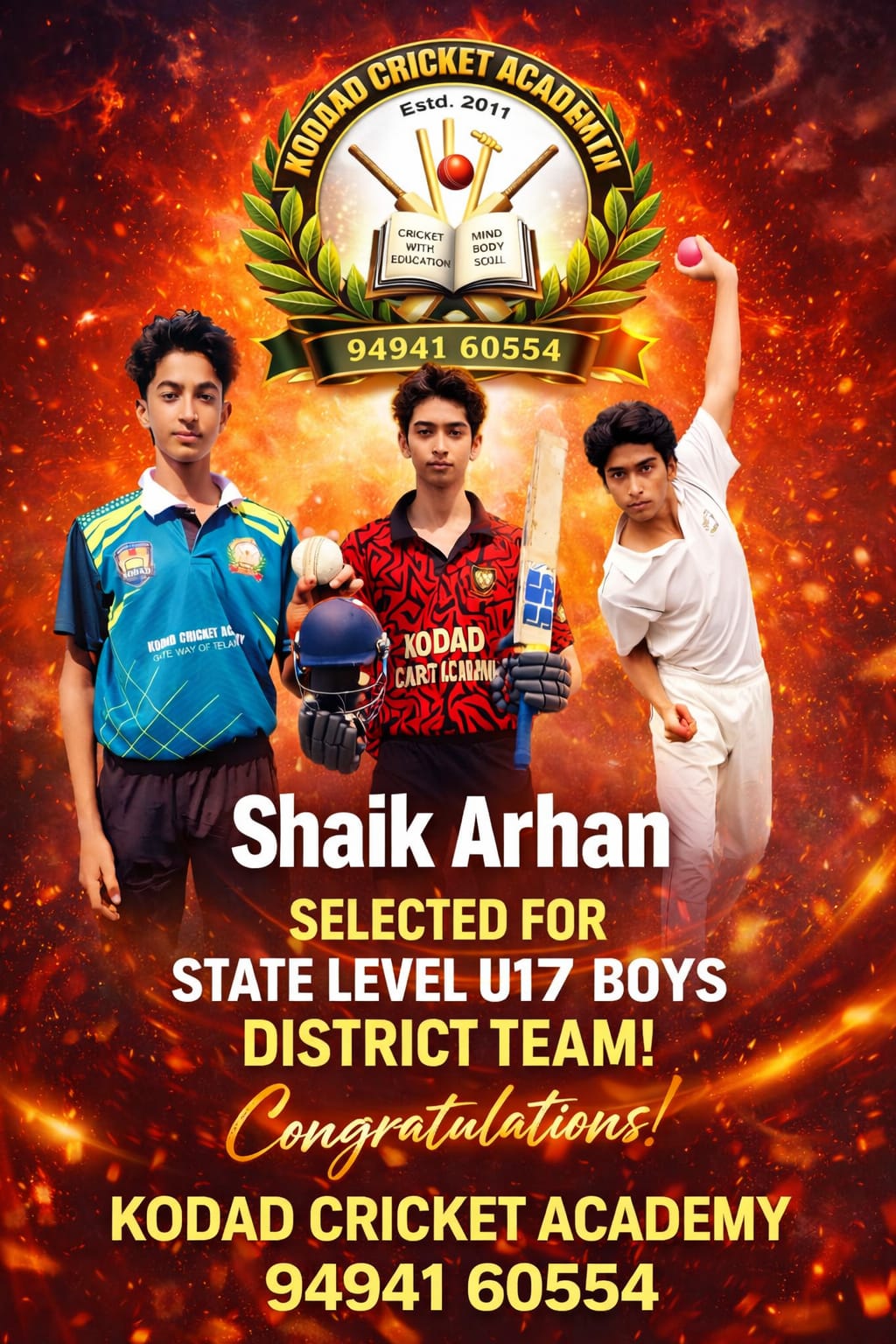 Mbmtelugunews//కోదాడ, ఫిబ్రవరి 13(ప్రతినిధి మాతంగి సురేష్): స్కూల్ గేమ్ ఫెడరేషన్ తెలంగాణ ఆధ్వర్యంలో ఫిబ్రవరి 13 నుండి 16 వరకు జడ్చర్ల వేదికగా నిర్వహించబడుతున్న 69వ రాష్ట్రస్థాయి అండర్–17 క్రికెట్ పోటీలలో పాల్గొనే ఉమ్మడి నల్గొండ జిల్లా జట్టుకు కోదాడ క్రికెట్ అకాడమీ కి చెందిన ప్రతిభావంతుడైన క్రీడాకారుడు షేక్ అర్హన్ ఎంపికైనట్లు కోచ్ సిద్ధిఖ్ తెలిపారు. అర్హన్ తన క్రమశిక్షణ, పట్టుదల, కఠిన సాధనతో ఈ స్థాయికి చేరుకున్నాడు. ప్రతిరోజూ ఉదయం, సాయంత్రం రెండు సెషన్లలో నియమిత ప్రాక్టీస్ చేస్తూ తన ఆటను మెరుగుపరుచుకుంటున్నాడు. ముఖ్యంగా ఫాస్ట్ బౌలింగ్లో ప్రత్యేక నైపుణ్యం సాధించేందుకు రన్-అప్ కంట్రోల్, లైన్ అండ్ లెంగ్త్, యార్కర్లు, బౌన్సర్లు వంటి బౌలింగ్ మెళుకువలను సాధన చేస్తున్నాడు. అదనంగా ఫిట్నెస్పై ప్రత్యేక శ్రద్ధ చూపిస్తూ స్ప్రింట్స్, స్టామినా ట్రైనింగ్, జిమ్ వర్కౌట్స్, ఫీల్డింగ్ డ్రిల్స్ వంటి వ్యాయామాలతో శారీరక దృఢత్వాన్ని పెంపొందించుకున్నాడు. మ్యాచ్ పరిస్థితులను ఎదుర్కొనే మానసిక ధైర్యం ఆత్మవిశ్వాసం కూడా అలవర్చుకున్నాడు. ఈ విజయానికి అకాడమీ కోచ్ షేక్ అబూబకర్ సిద్దిఖ్ శిక్షణ, మార్గదర్శనం, నిరంతర ప్రోత్సాహం ప్రధాన కారణమని నిర్వాహకులు తెలిపారు. రాష్ట్రస్థాయిలో అర్హన్ ఉత్తమ ప్రదర్శన చేసి జిల్లా, అకాడమీకి మంచి పేరు తీసుకురావాలని క్రీడాభిమానులు ఆకాంక్షిస్తూ అభినందనలు తెలియజేశారు. తల్లిదండ్రులు అతనిని అభినందిస్తూ, భవిష్యత్తులో మరిన్ని విజయాలు సాధించాలని ఆకాంక్షించారు. ఈ సందర్భంగా కోదాడ క్రికెట్ అసోసియేషన్ అధ్యక్షులు డాక్టర్ కొత్తపల్లి సురేష్, మండల విద్యాశాఖ అధికారి మొహమ్మద్ సలీం షరీఫ్,